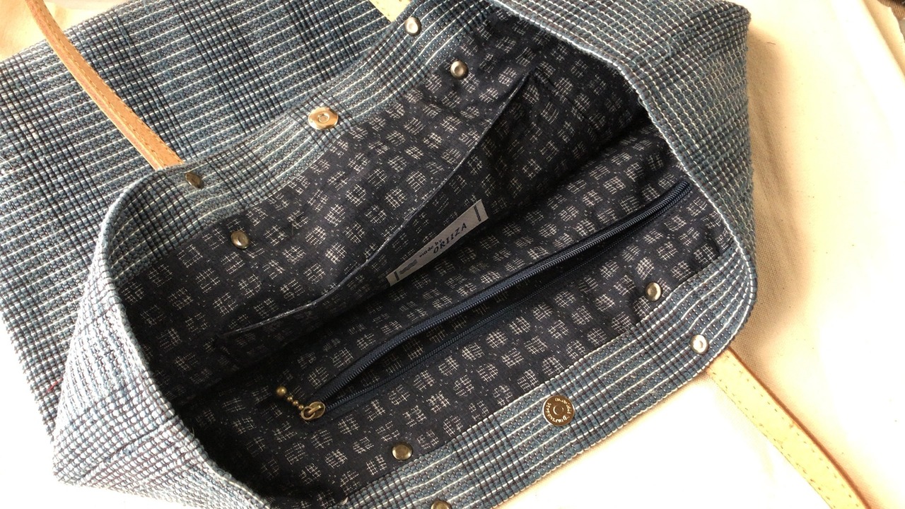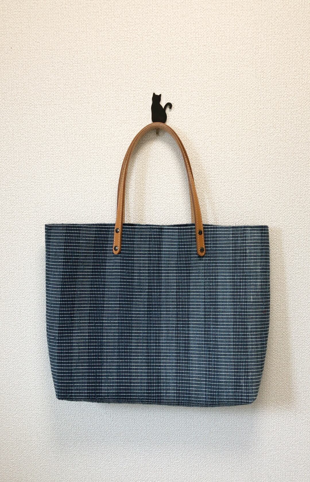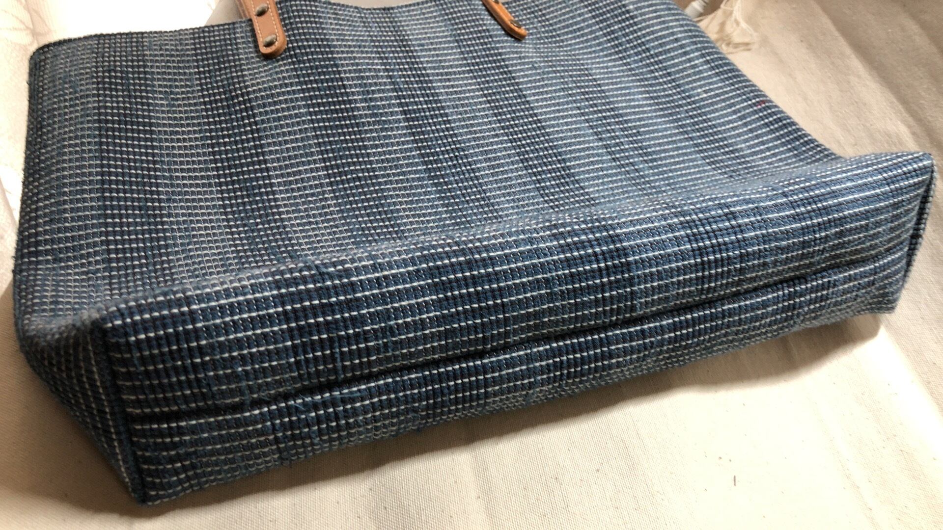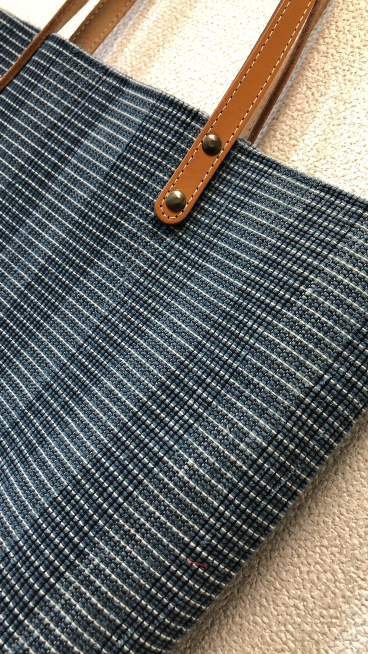 裂き織り ショルダーバッグ(青系)本革持ち手