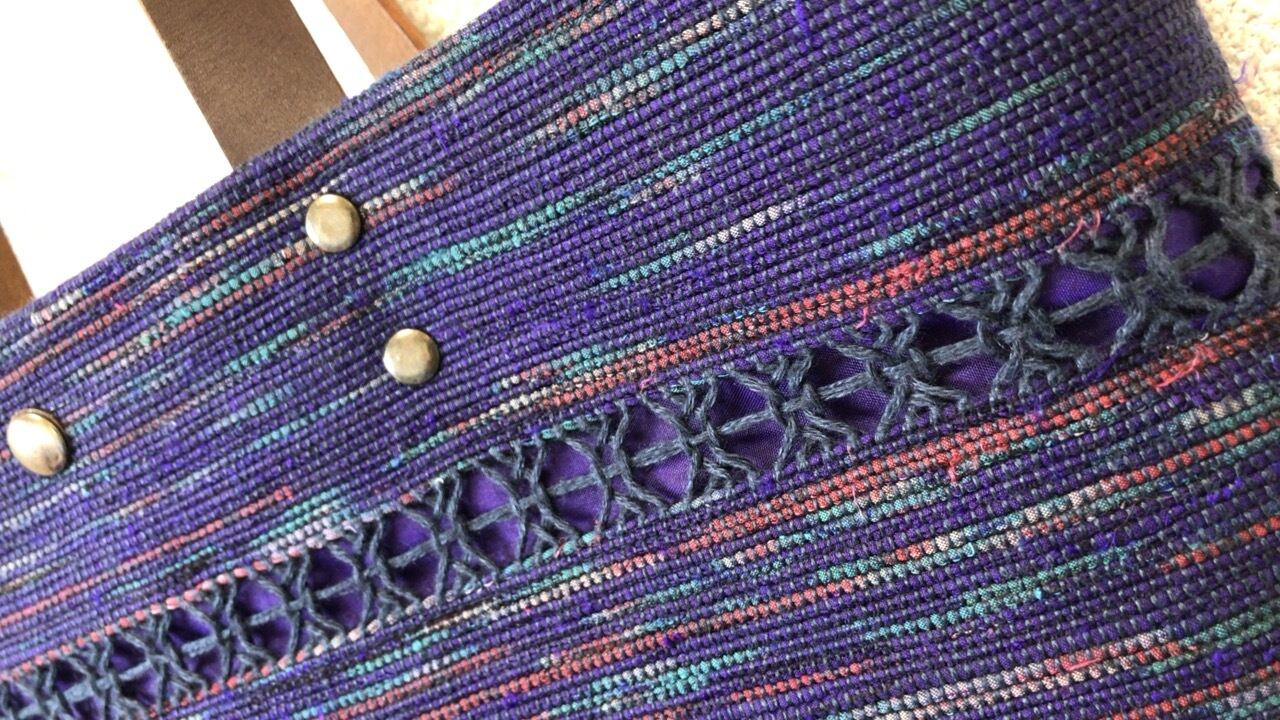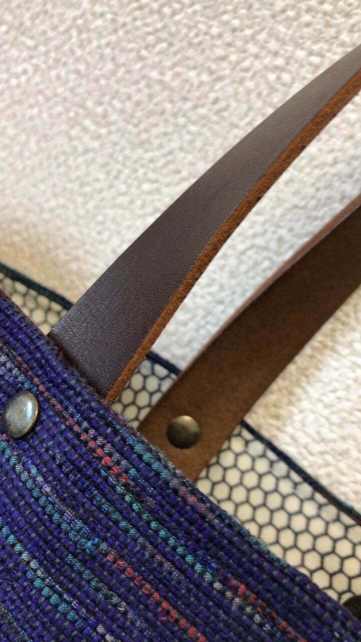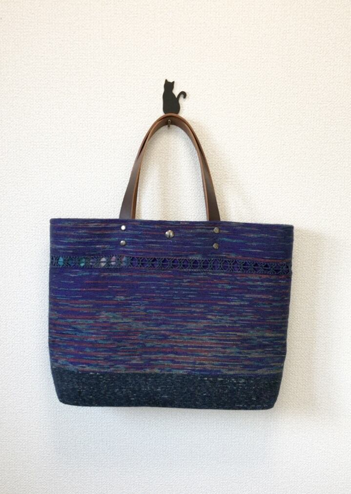 裂き織り レース織模様のトートバッグ(本革持ち手)青系