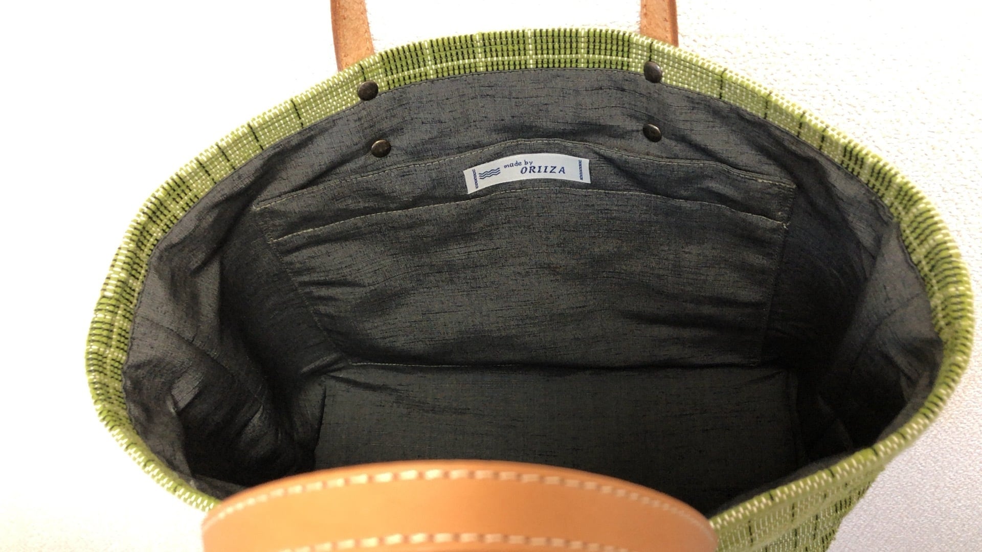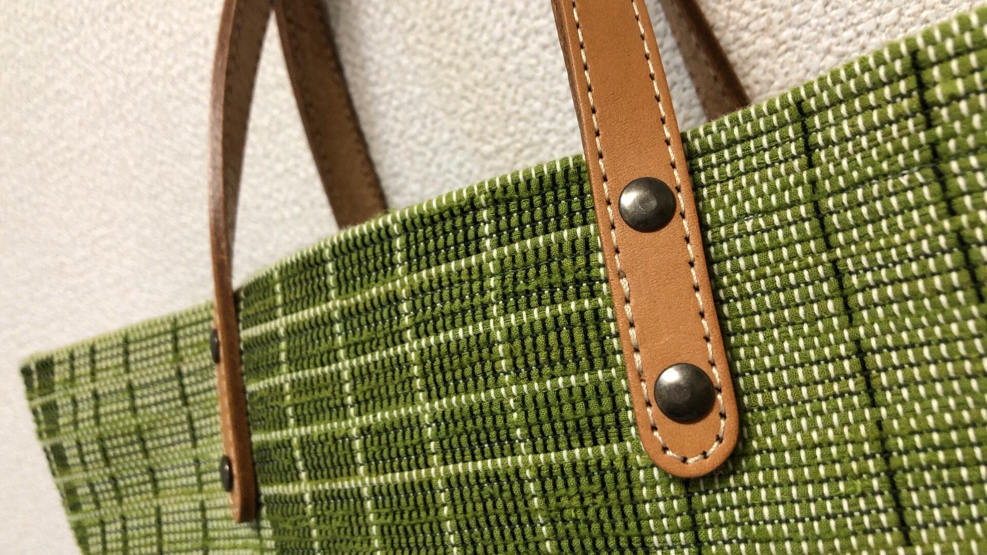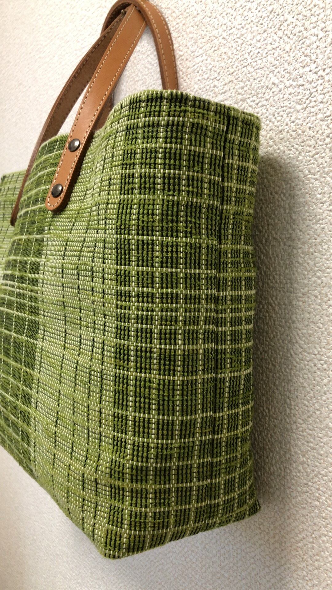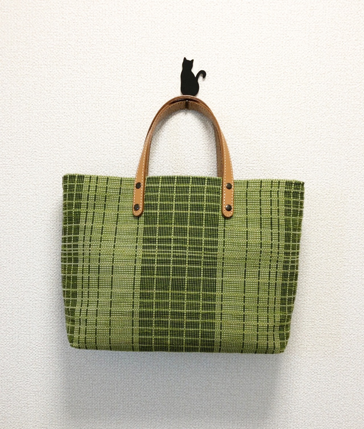 裂き織りバッグ~グリーンチェック~(本革持ち手)