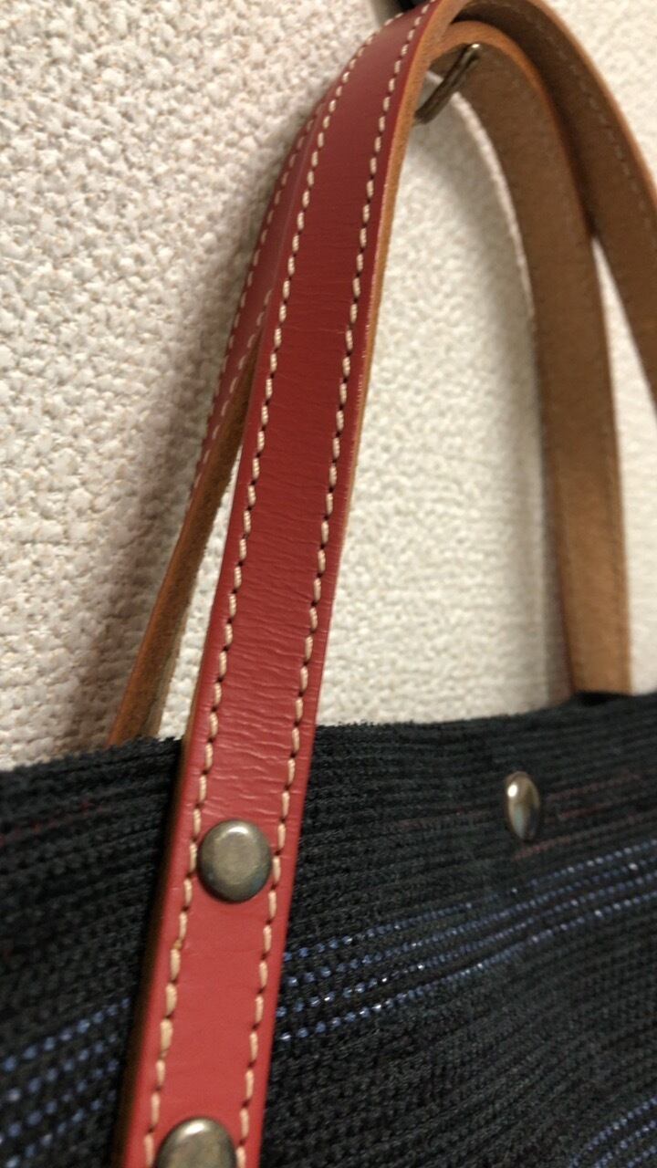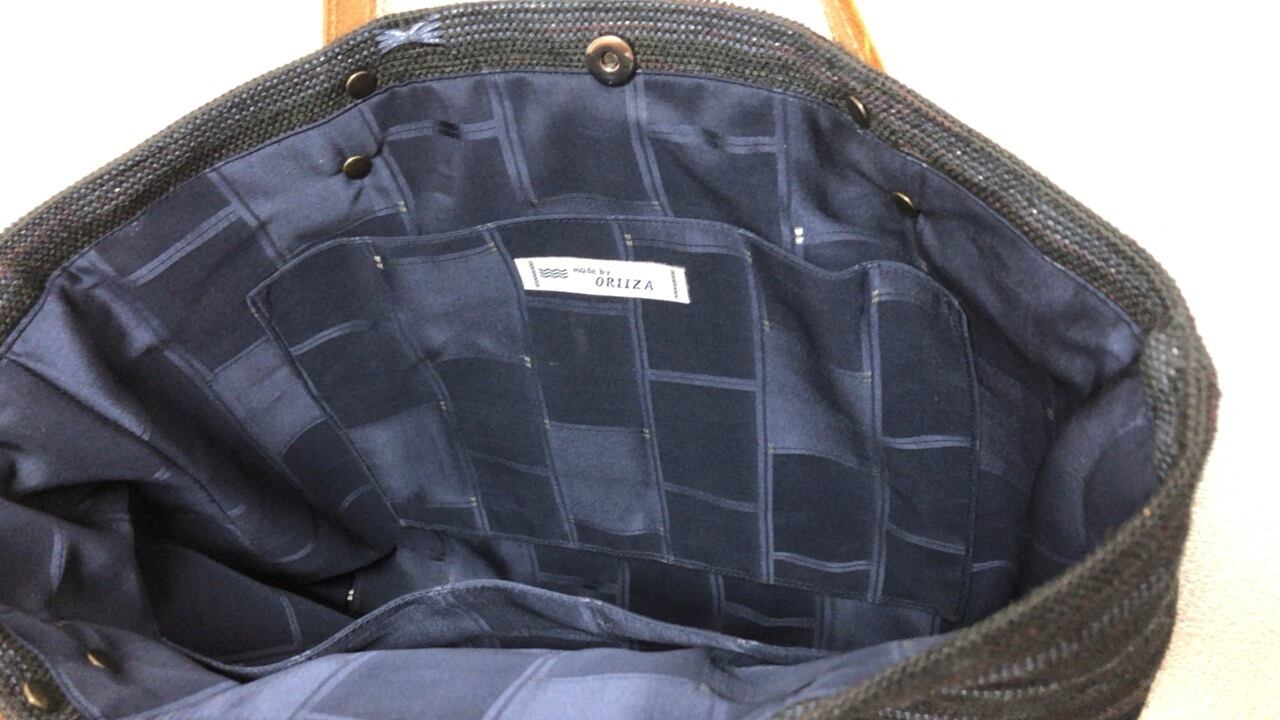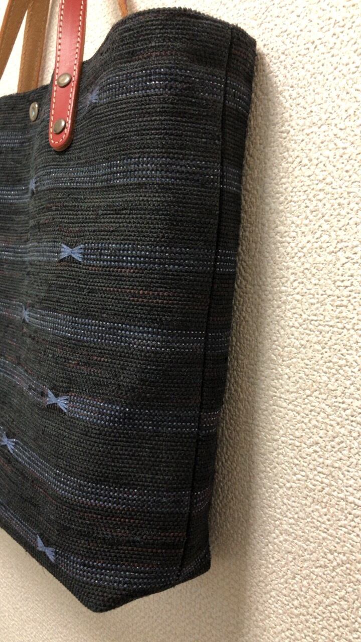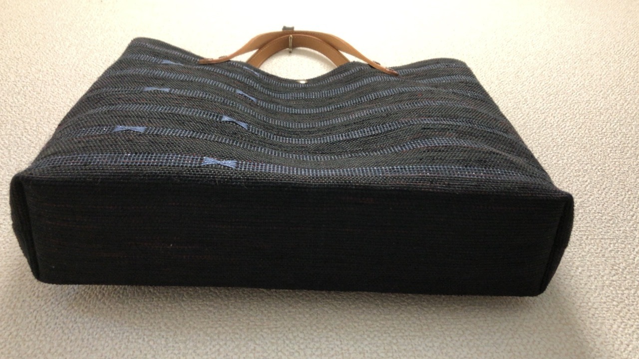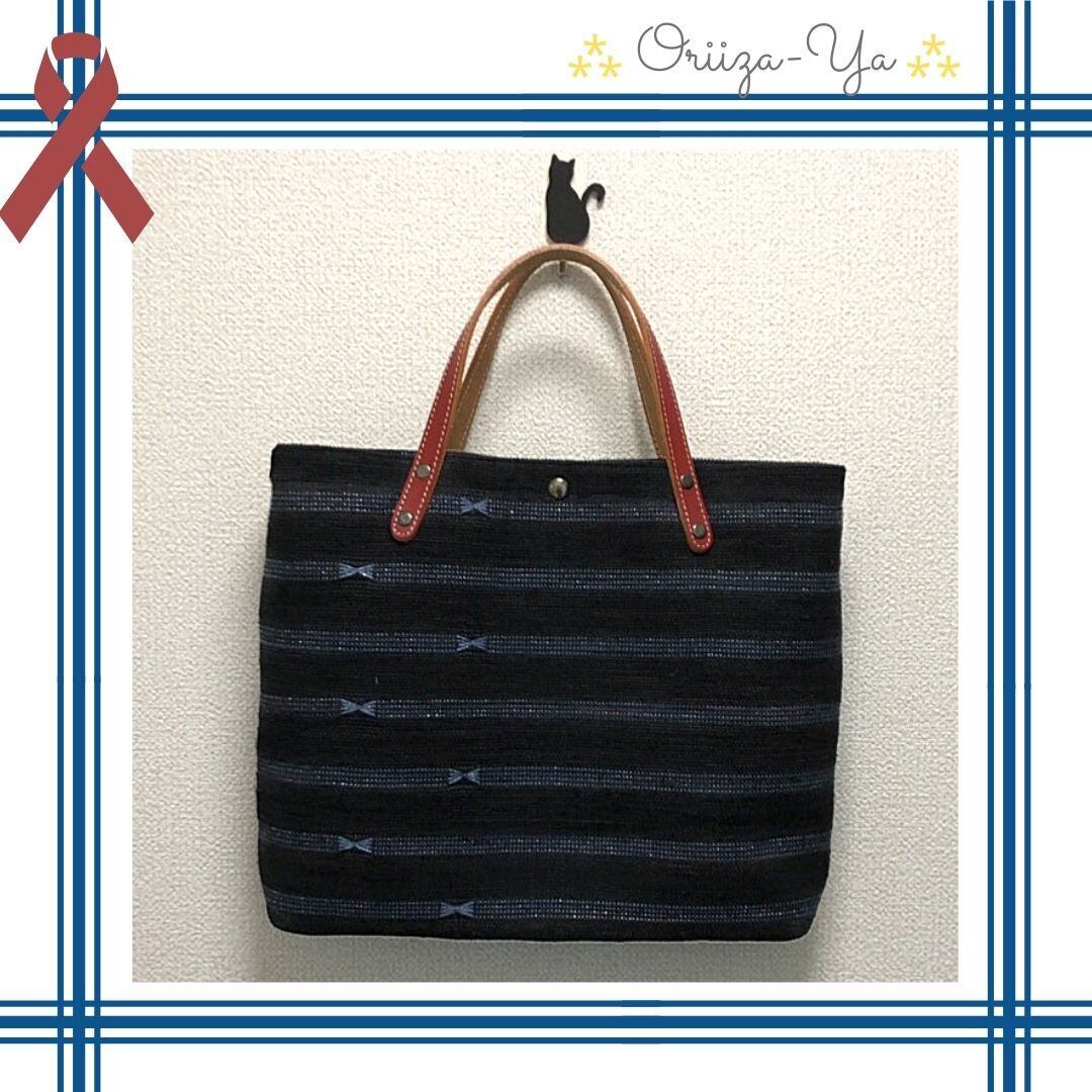 裂き織り ボーダーリボンバッグ(黒×青)本革持ち手