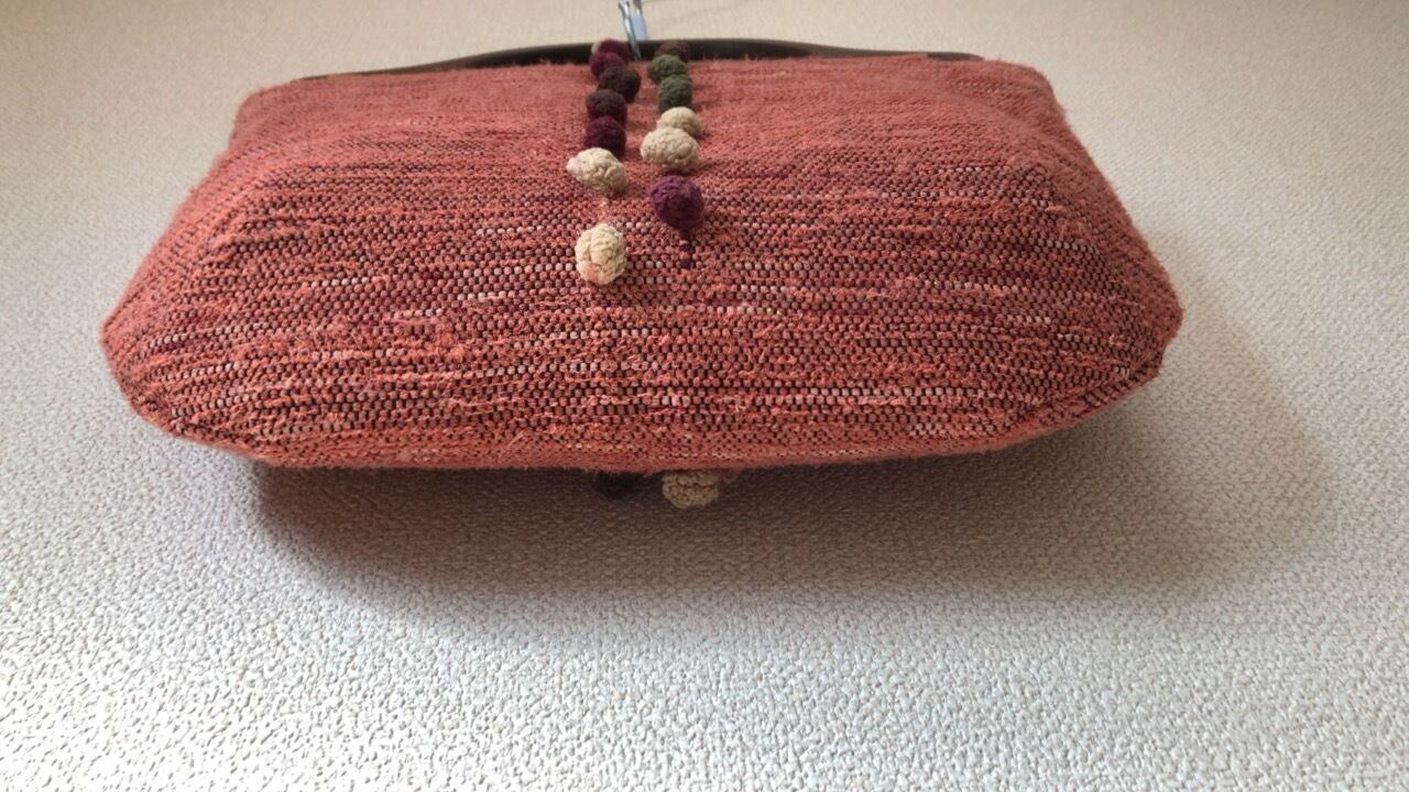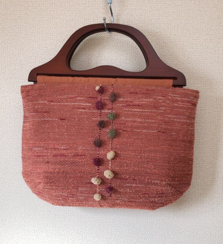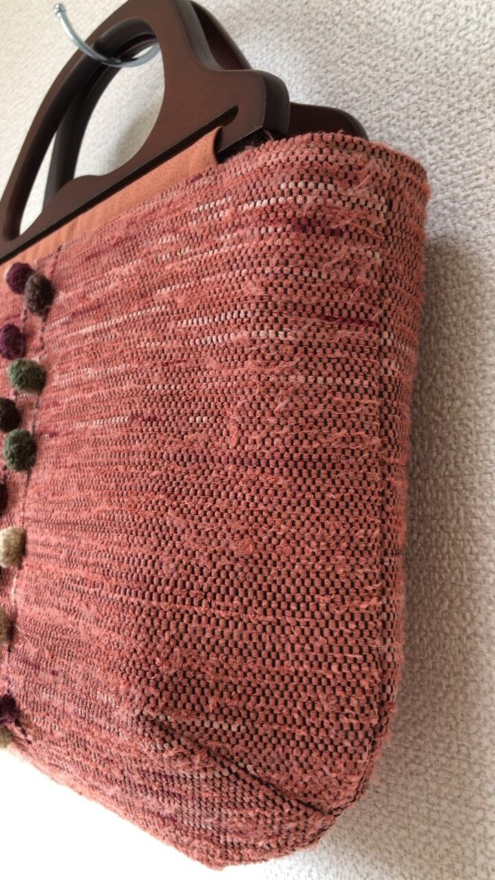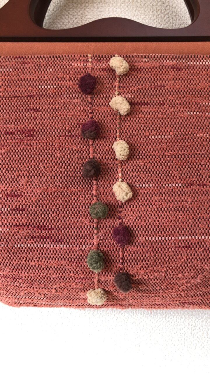 裂き織り ポンポンのハンドバッグ(木製持ち手)