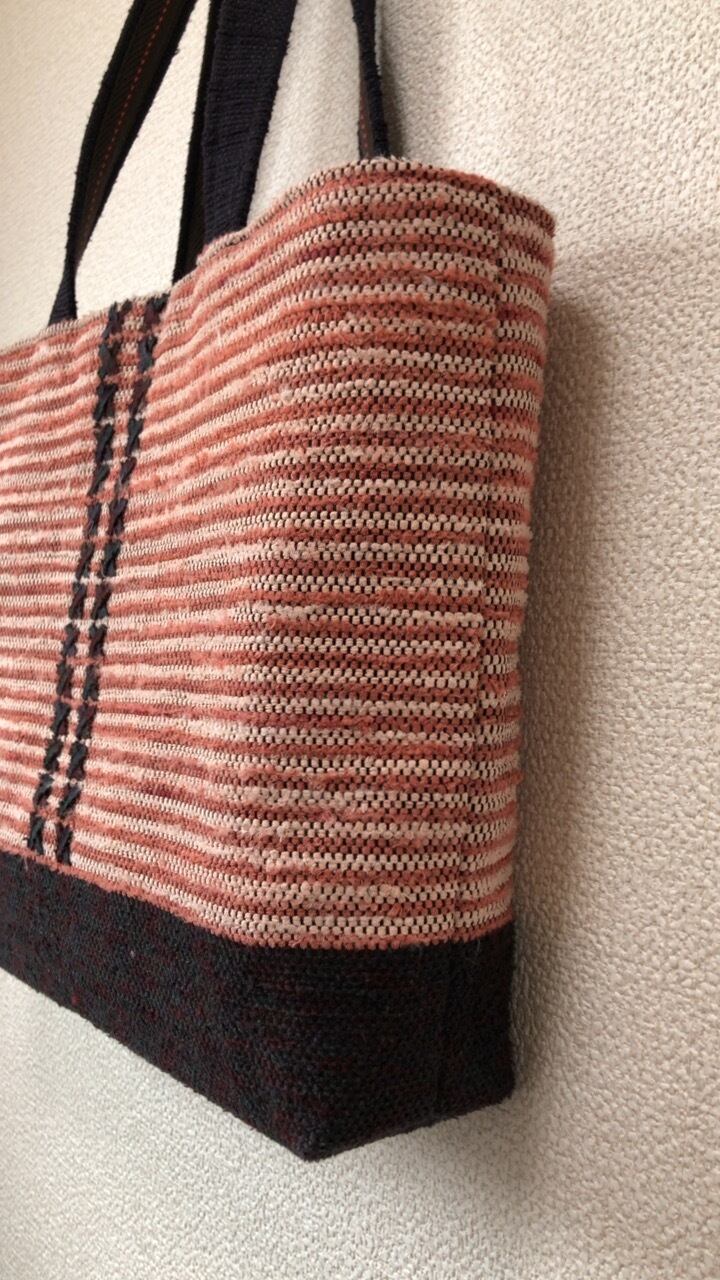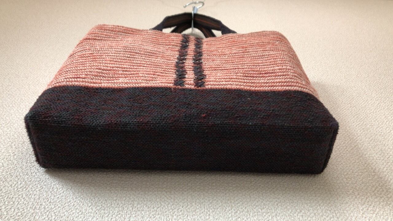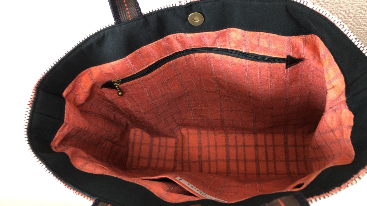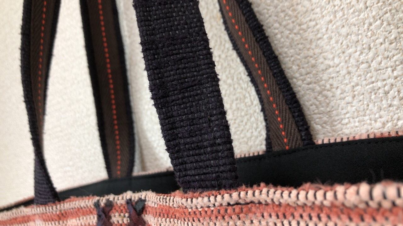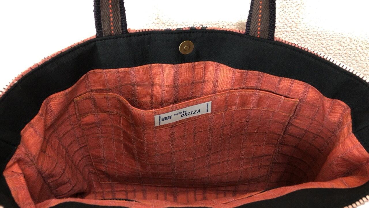 持ち手も裂き織りで、内側はオレンジライン入の杉綾テープ