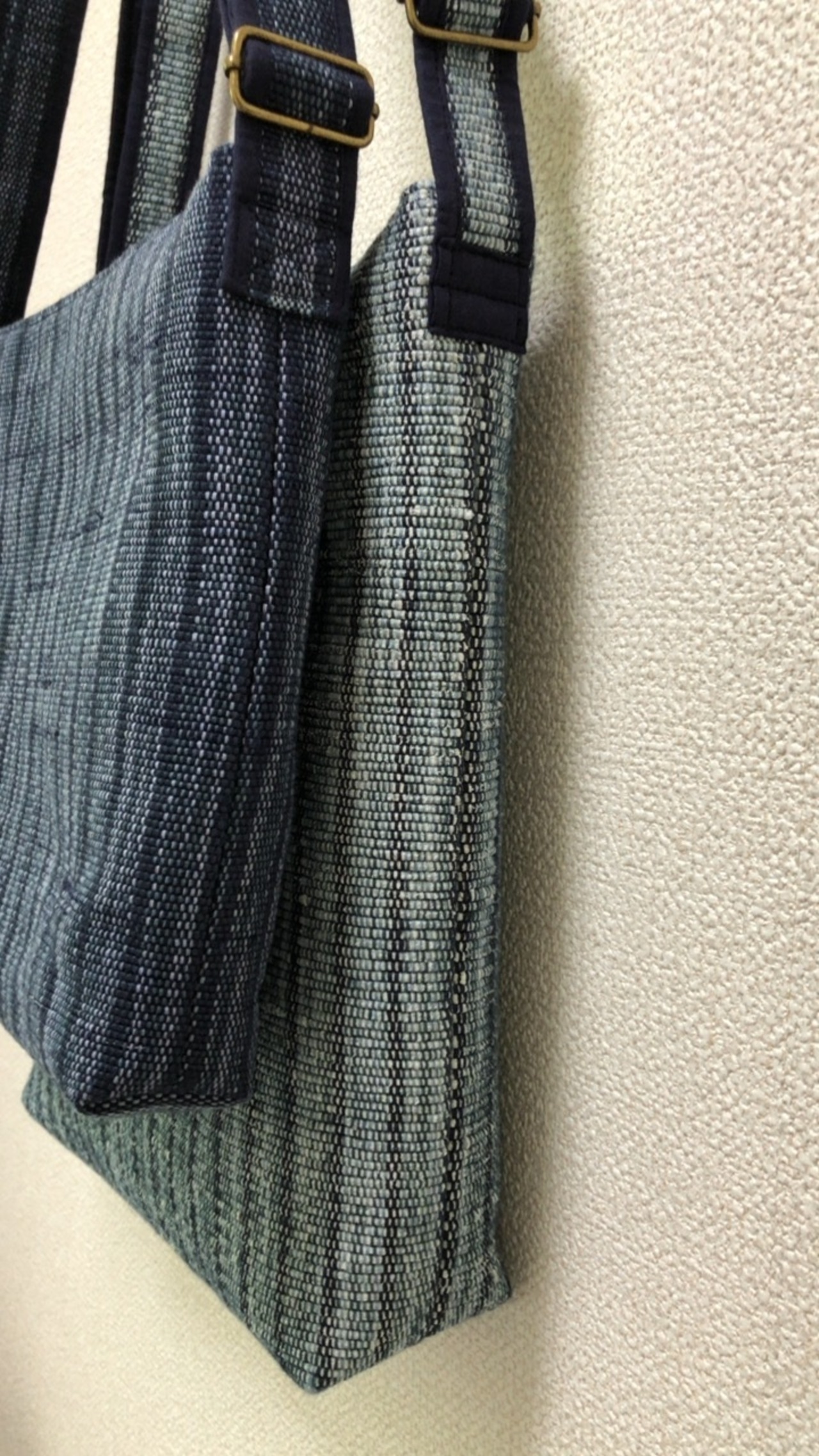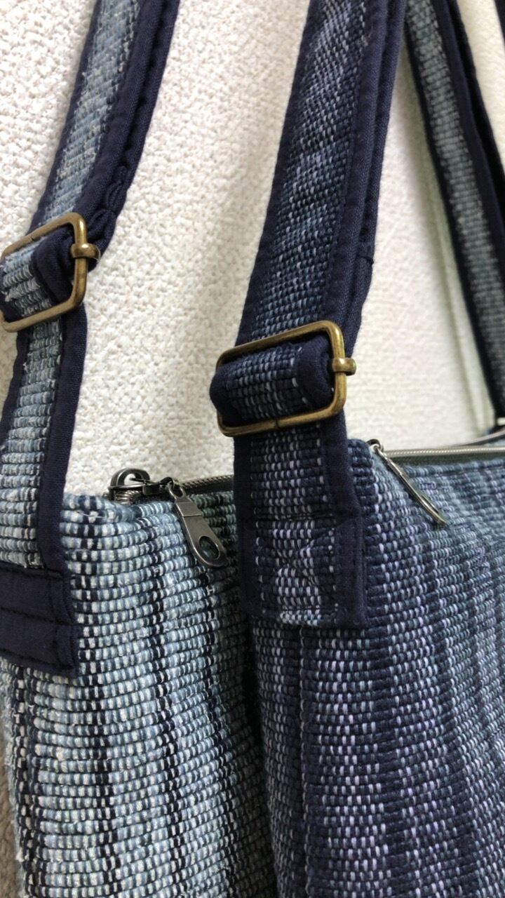 経糸に紺のリネンと、青系段染めの綿糸等使用しており、